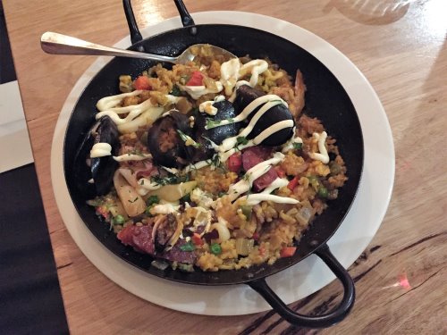Food and WineFig & Olive has been a fixture in Thompson Ave, Cowes for quite a few years now. In a previous life it was known as Infused.Making a reservation, we have to accept a later sitting due to the increase in diners brought in by the long weekend, especially large family groups. The restaurant has a contemporary décor with one end dominated by the pizza oven, which brings a nice atmosphere on a wintry night. We start with the shared platter which has a gluten free option. Unfortunately it was not suitable for coeliacs as some foods had been fried in the same oil as breaded foods. Ultimately we aren’t charged for the platter because of this mix up. For main I order the seafood paella with prawns, calamari, mussels and chorizo. With stripes of mayonnaise across the top it has an American, not Spanish, look. Nevertheless it was tasty. I always enjoy Fig & Olive and will return but coeliacs, as at any restaurant, need to be alert.