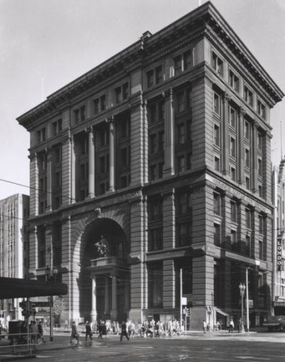 Quite a few trips were made to Melbourne with a load of granite. However disaster struck on December 10, 1892 with the sinking of the Kermandie. The Kermandie had left the quarry with a load of granite in its hold and also strapped on the deck. She then had a cargo of wool loaded in San Remo. After sheltering from bad weather at Rhyll for a few days, she set out for Melbourne despite further dire weather forecasts. Possibly due to the weather, or because of shifting cargo, or a combination of both, she disappeared. It was soon after the sinking of the Kermandie that the quarry was closed. It appears that the Cape Woolamai granite that did reach Melbourne was used for only one building – the Colonial Mutual Life building built by Equitable Life Assurance of the USA, on the corner of Collins and Elizabeth Streets. Cape Woolamai granite was used in the base-courses and also in the impressive portico. Unfortunately, the building was demolished in 1960, one of the many fine old Melbourne buildings which suffered this fate at that time. Some of the salvaged pink granite is at the Melbourne Museum and the statue from the portico is now at Melbourne University, near the Baillieu Library.